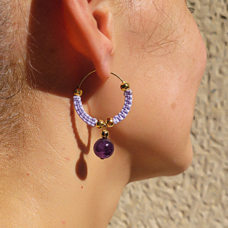 Ces boucles d'oreilles originales sont fabriquées en plaqué or 24k avec un joli tressage violet ainsi qu'une perle en pierre naturelle d'amethyste.