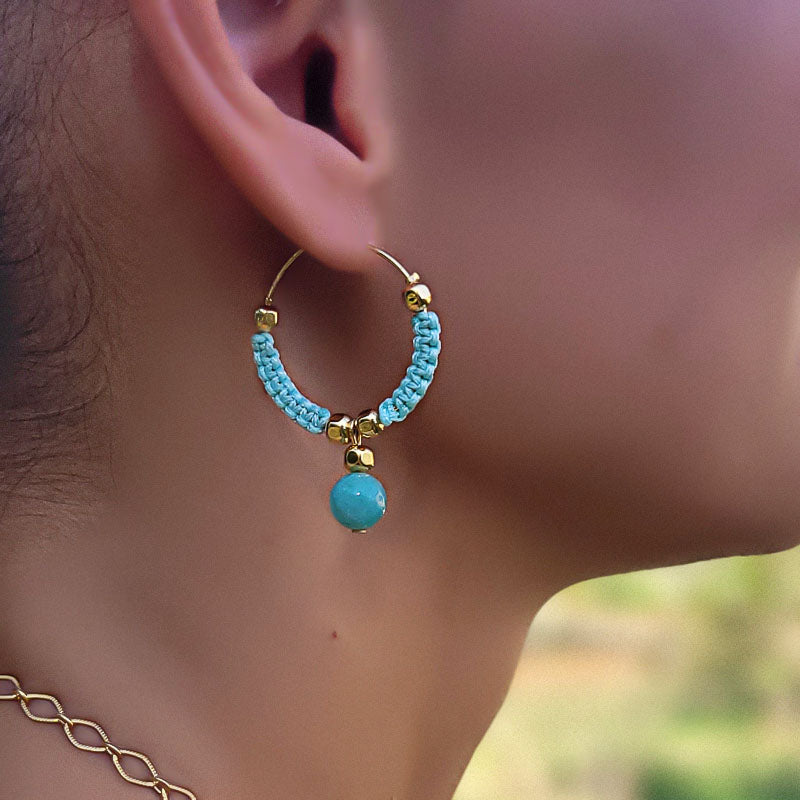 Ces boucles d'oreilles originales sont fabriquées en plaqué or 24k avec un joli tressage turquoise ainsi qu'une perle en pierre naturelle d'amazonite.