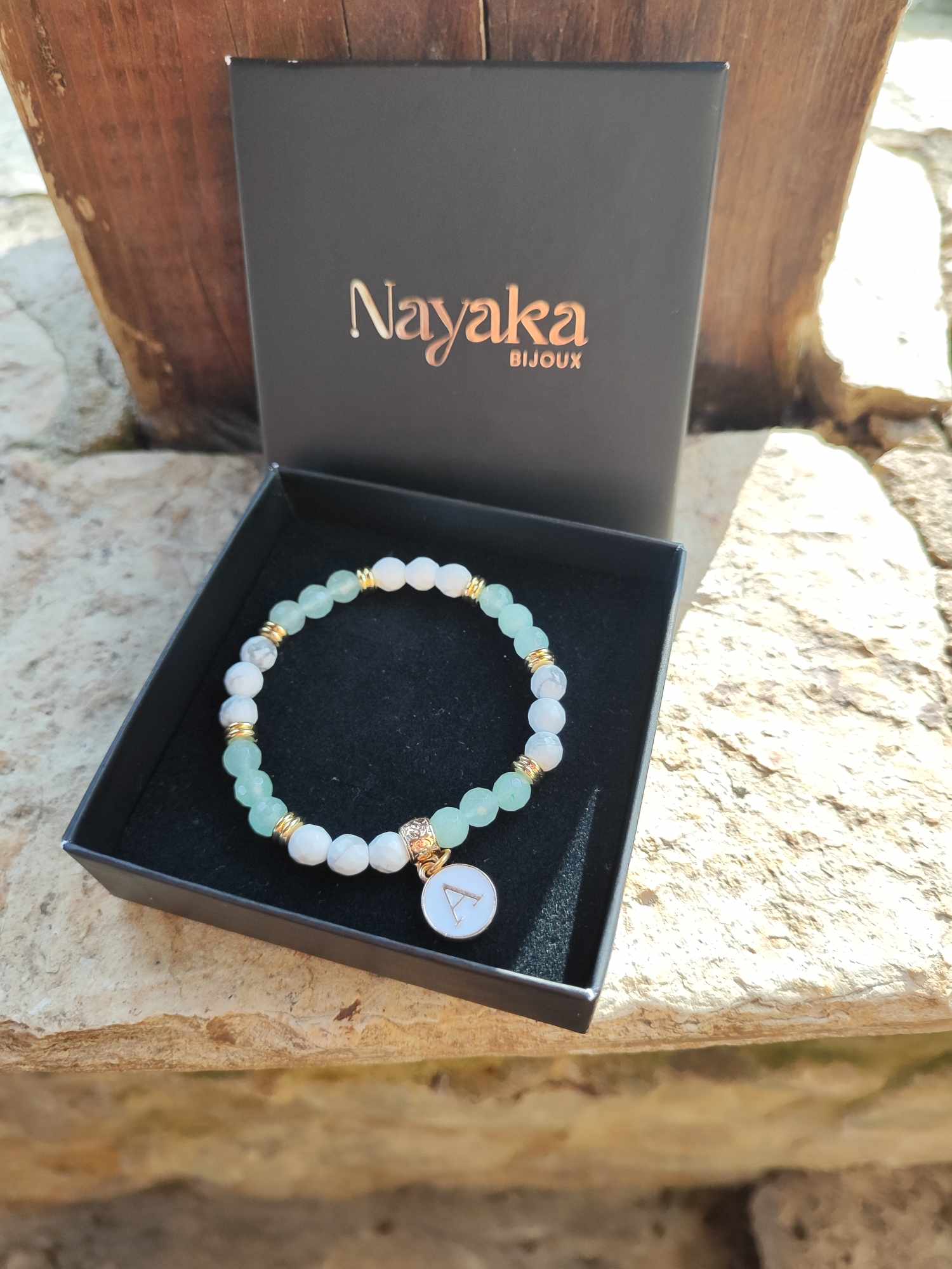 Bracelet en pierres naturelles d'howlite et aventurine à facettes avec breloque initiale prénom.